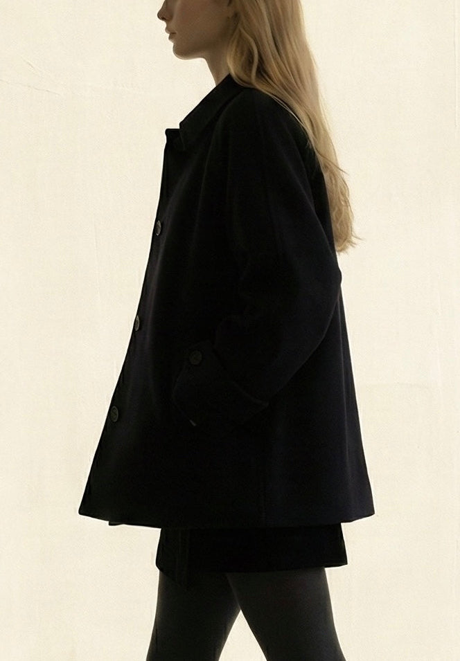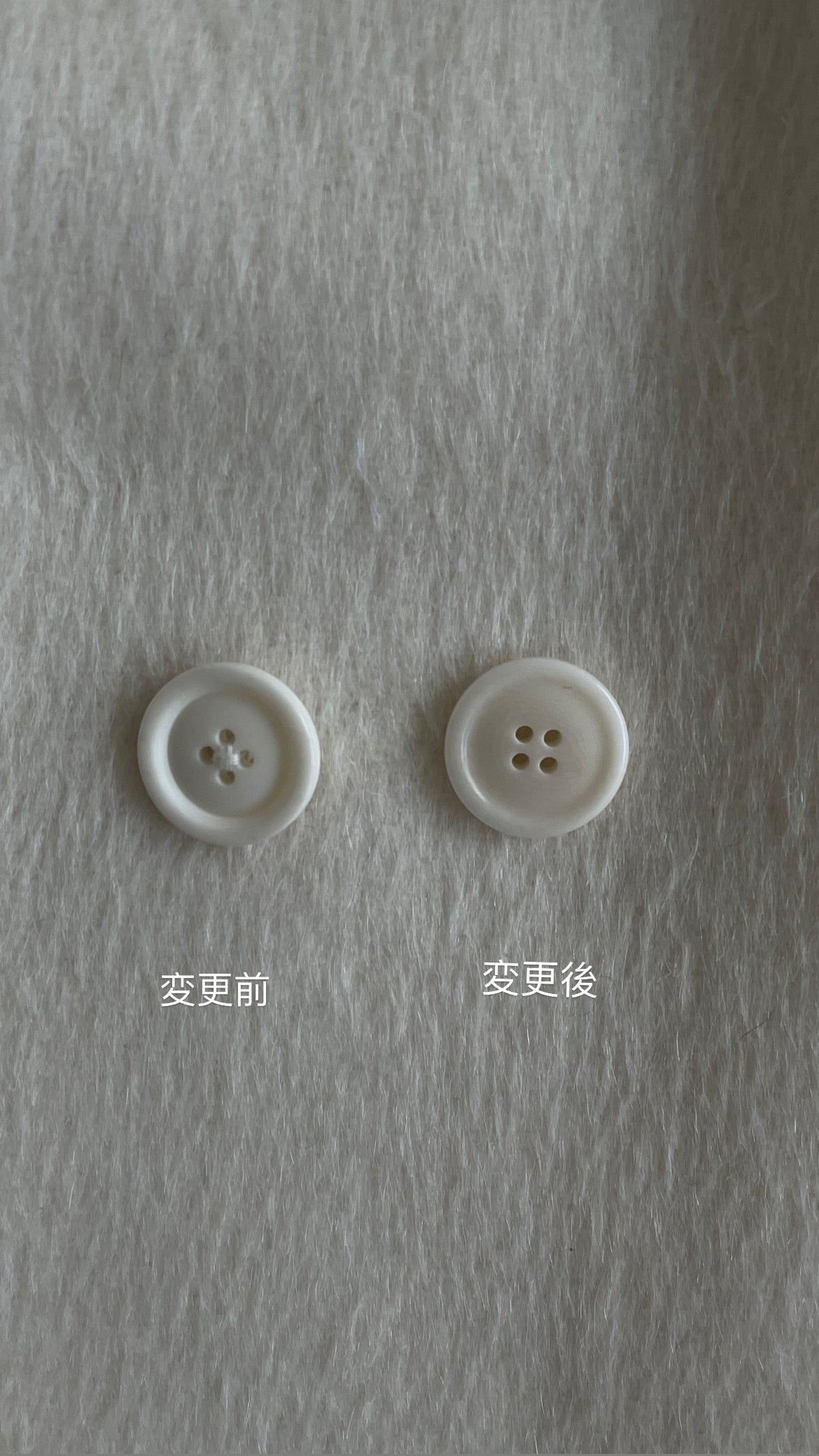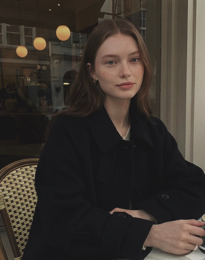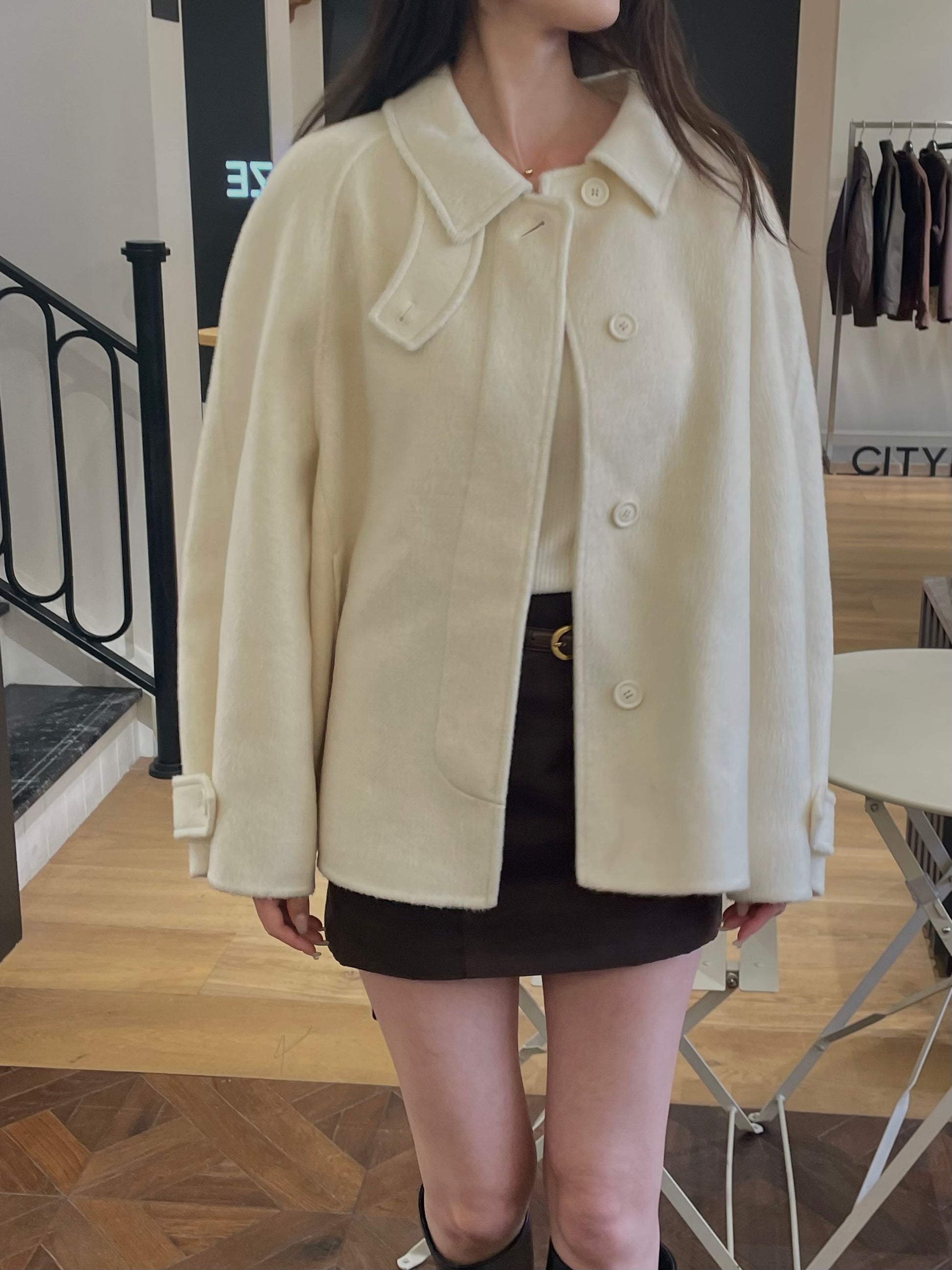 *クリームカラーのコートは、着用写真とは異なり、ワントーン暖かみのあるボタンカラーに変更して発売されています。最後のカットの生地写真をご確認ください