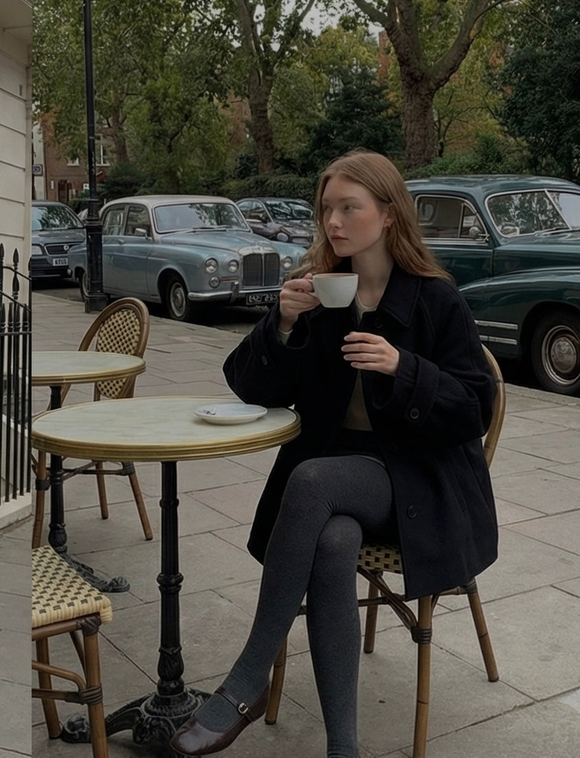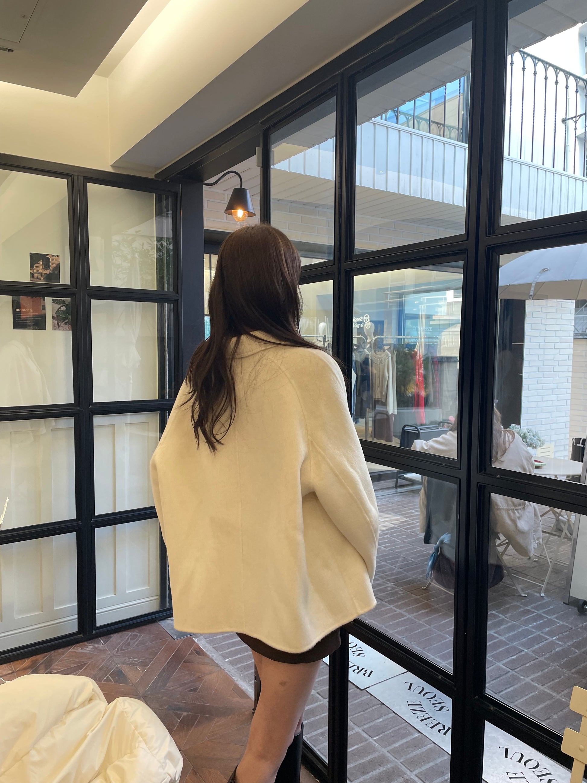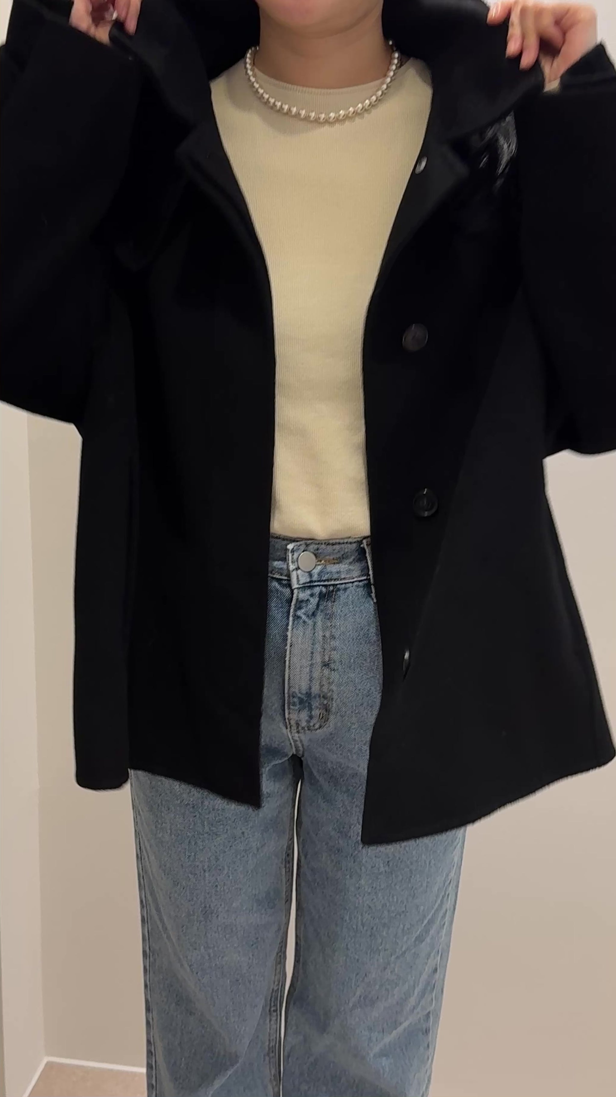 *クリームカラーのコートは、着用写真とは異なり、ワントーン暖かみのあるボタンカラーに変更して発売されています。最後のカットの生地写真をご確認ください