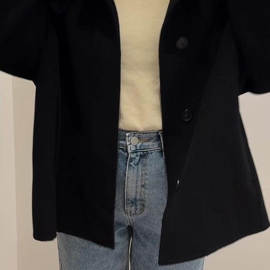 2つ目のボタンを留めると、ほどよいパフシルエットが生まれ、