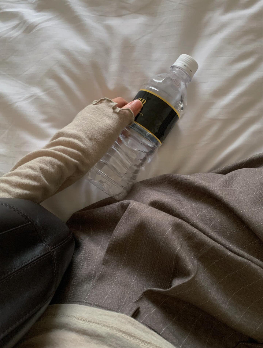 手の甲をすっぽり包み込む袖丈で痩せて見えます。
